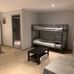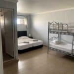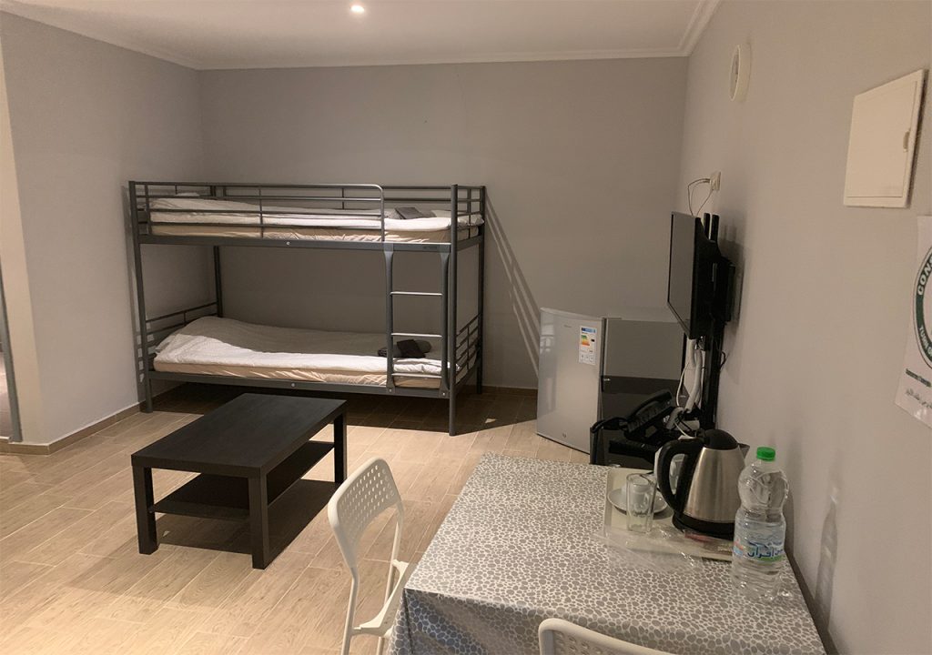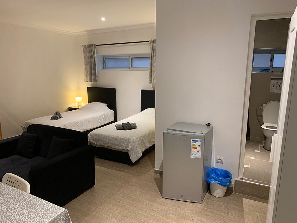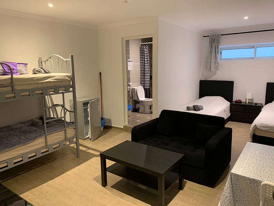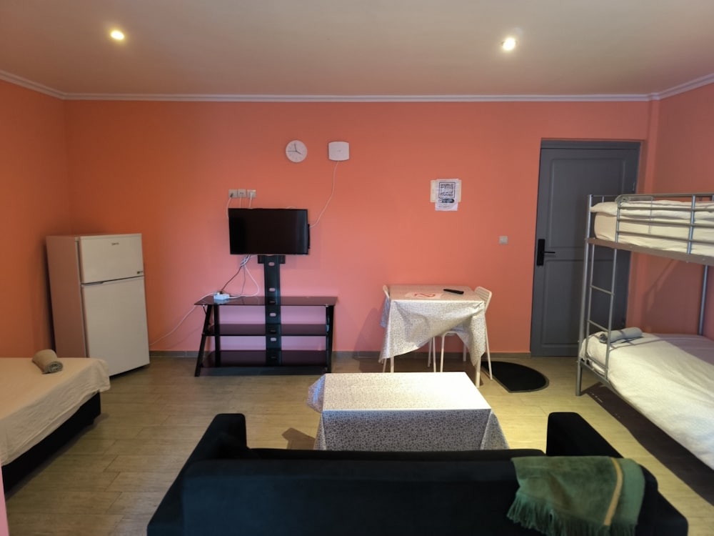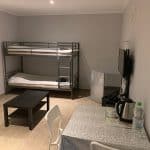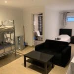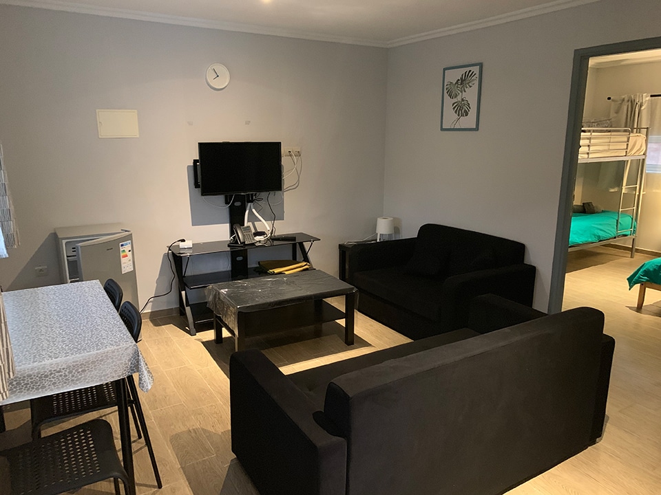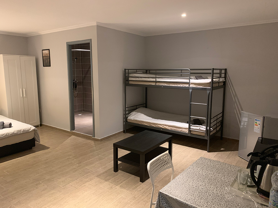 Spacious studio with private bathroom, kitchen, and garden. Includes double or twin beds, 1 single bed, and a double bunk bed (5 beds total). Furnished with a sofa, coffee table, dining table, fridge, and wardrobe. Sleeps up to 5 guests.