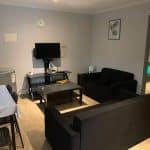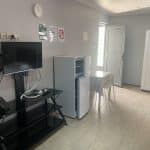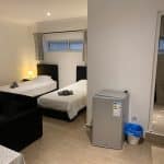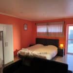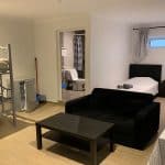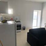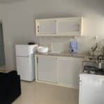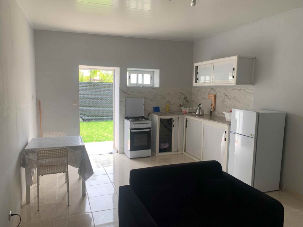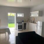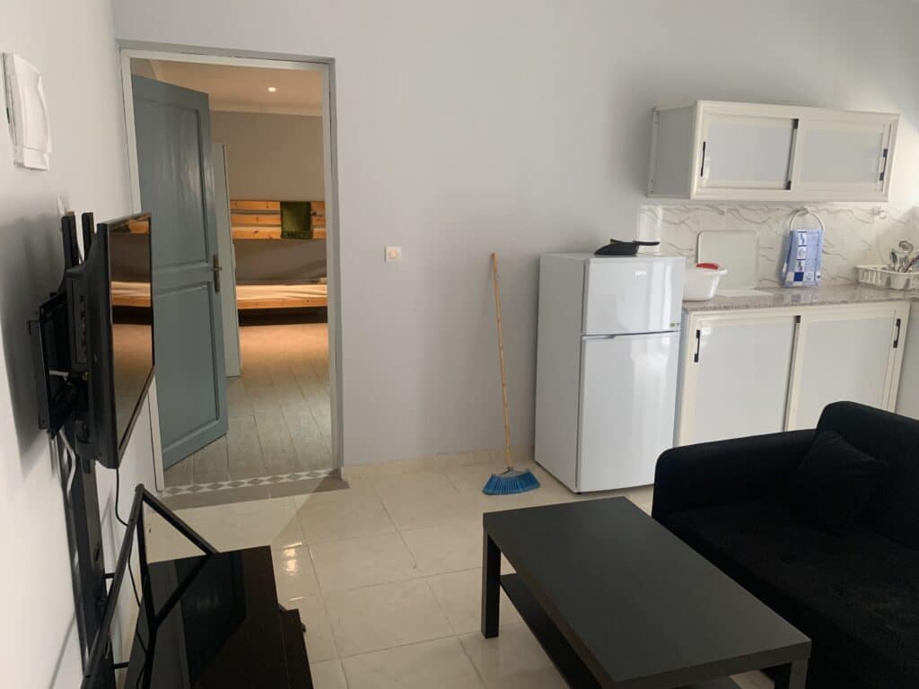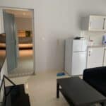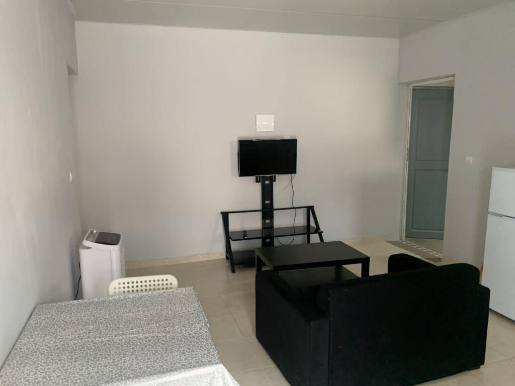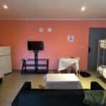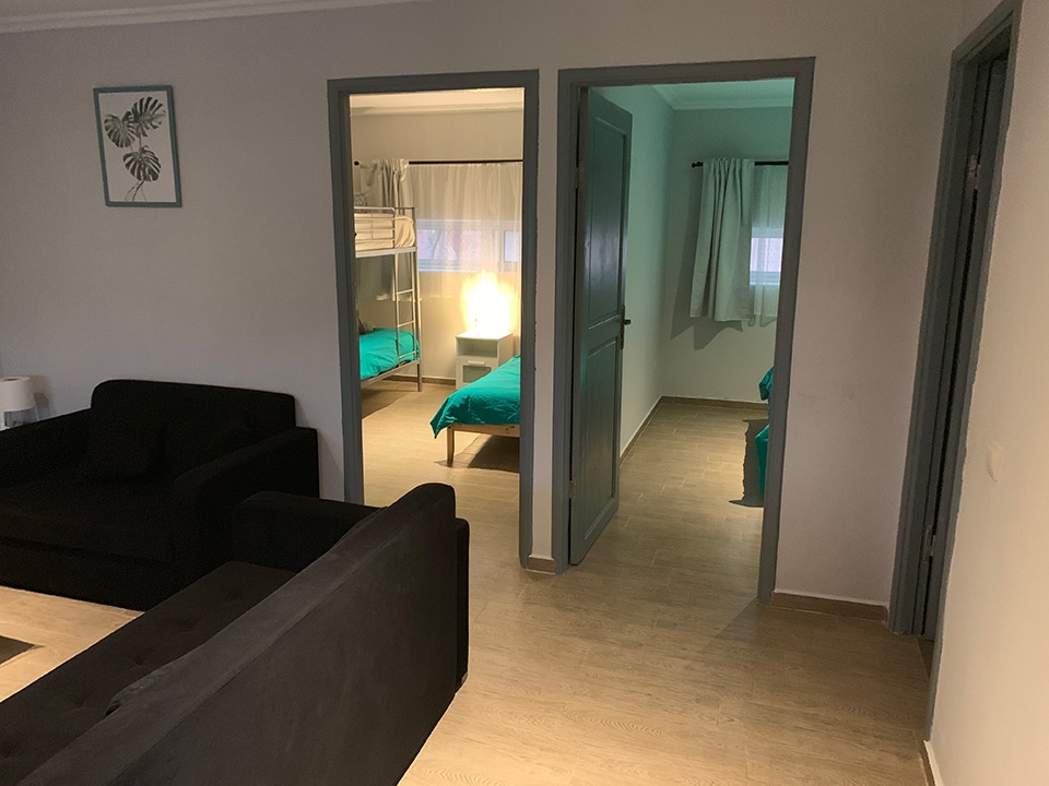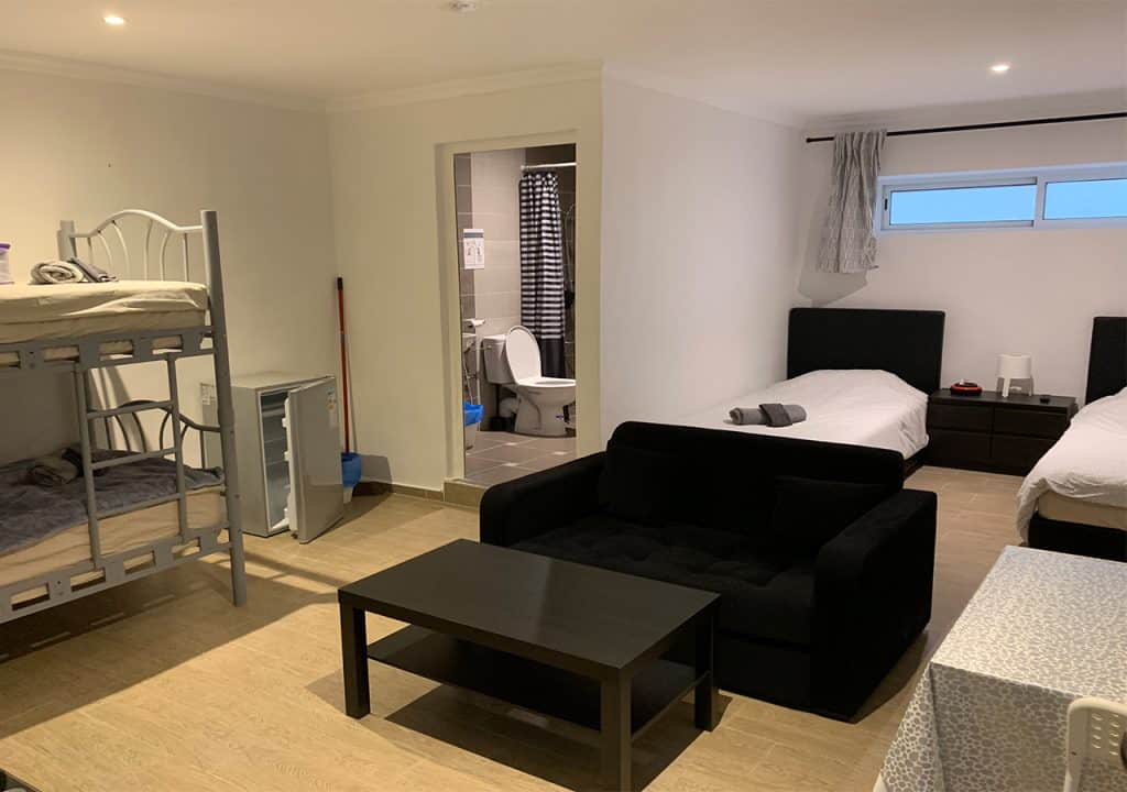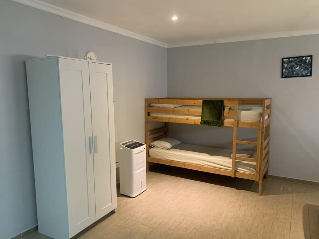 Spacious studio with private bathroom, kitchen, and garden. Includes double or twin beds, 1 single bed, and a double bunk bed (5 beds total). Furnished with a sofa, coffee table, dining table, fridge, and wardrobe. Sleeps up to 5 guests.