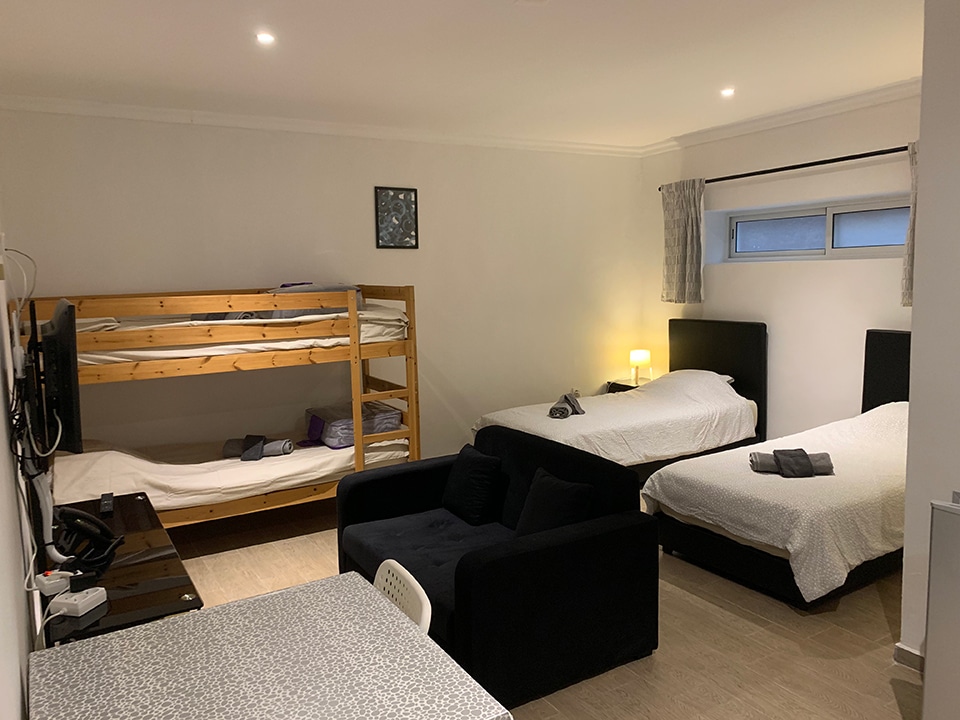 استوديو واسع مع حمام خاص ومطبخ وحديقة. يشمل سريرين مزدوجين أو سريرين مفردين، وسرير واحد مفرد، وسرير مزدوج بطابقين (إجمالي 5 أسرّة). مفروشة بأريكة، وطاولة قهوة، وطاولة طعام، وثلاجة، وخزانة ملابس. تتسع حتى 5 نزلاء.